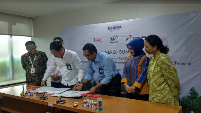 Sinergi tersebut dituangkan dalam nota kesepahaman. Kedua nota kesepahaman secara resmi ditandatangani di Kantor Kementerian BUMN pada Senin (3/12/2018), dilakukan langsung Direktur Pemasaran Ritel PT Pertamina (Persero) Mas'ud Khamid dengan Direktur Human Capital dan Pengembangan PT Hutama Karya (Persero) Putut Ariwibowo, dan Direktur Operasi II PT Waskita Karya (Persero) Tbk Bambang Rianto.