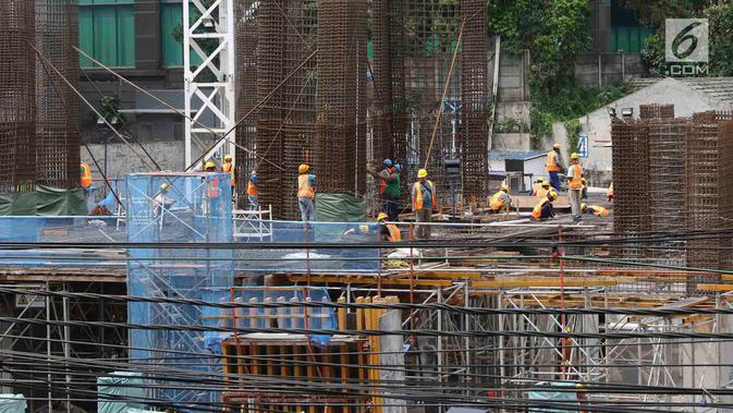 Pekerja membangun konstruksi bangunan bertingkat di Jakarta, Jumat (18/1). Kebijakan pembatasan baja impor oleh pemerintah sebagai respons terhadap keluhan pengusaha terkait banyaknya baja impor yang membanjiri Indonesia. (Liputan6.com/Immanuel Antonius)