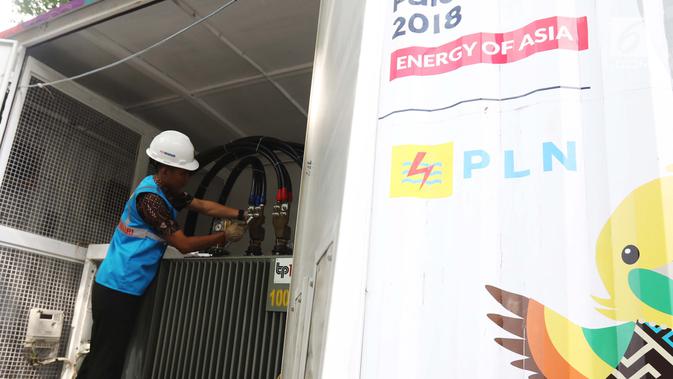 Teknisi mengecek Power Bank dan Mobile UPS penyuplai listrik di Hotel Sultan, Jakarta, (15/2). Pemasangan alat yang disediakan PLN itu untuk penyuplai pasokan listrik acara debat capres dan cawspres kedua pada Minggu besok. (Liputan6.com/Angga Yuniar)