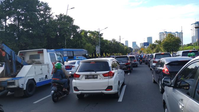 Pantauan Liputan6.com, di Jalan Gatot Subroto, Jakarta, Minggu (17/2/2019) Pukul 17.00 WIB, kemacetan terjadi mulai dari Polda Metro Jaya sampai Hotel Sultan seberang Gerbang Tol Senayan.