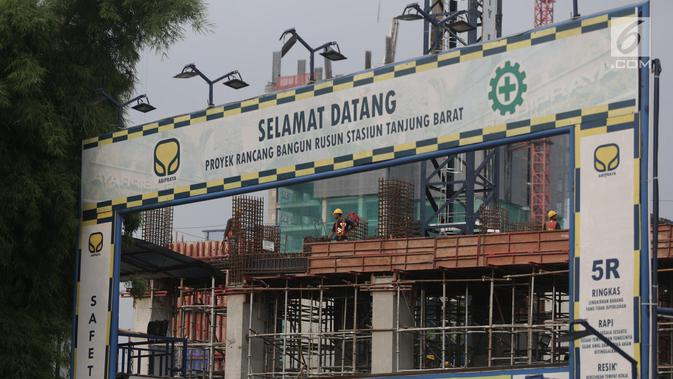 Pekerja beraktivitas di proyek pembangunan rumah susun terintegrasi dengan sarana transportasi atau Transit Oriented Development (TOD) di Tanjung Barat, Jakarta, Sabtu (11/5/2019). Pembangunan rusun TOD Stasiun Tanjung Barat itu ditargetkan rampung pada 2021 mendatang. (Liputan6.com/Angga Yuniar)