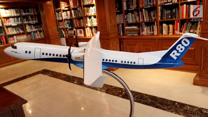 Bentuk bagian belakang replika Pesawat R80 yang dipamerkan saat penandatanganan Partneship Agreement dengan investor R80, Jakarta, 22 Februari 2018. Pesawat R80 ini didesain untuk penerbangan sipil yang akan memiliki teknologi dan kebutuhan pasar 5-10 tahun ke depan. (Liputan6.com/Johan Tallo)