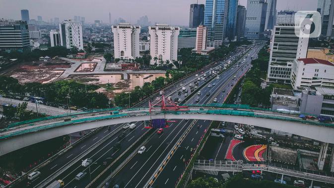 Foto udara pembangunan jalur kereta lintas rel terpadu (LRT) Jabodebek di Jakarta, Selasa (7/1/2020). Longspan Kuningan proyek LRT Jabodebek yang menjadi jembatan lengkung paling panjang di Indonesia memiliki panjang jembatan 148 meter dengan radius lengkungan 115 meter. (Liputan6.com/Faizal Fanani)