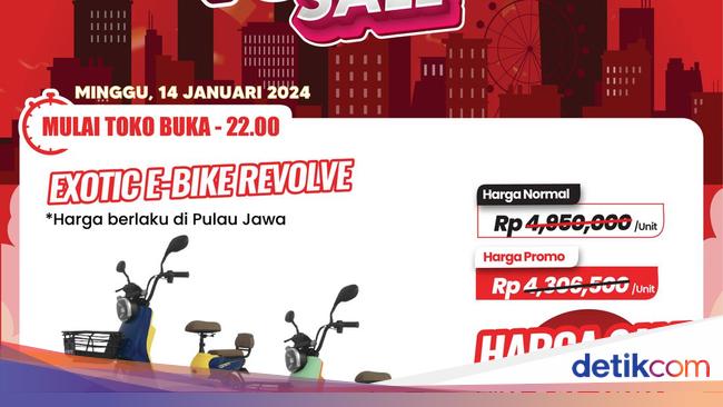 Salah satunya, ada diskon gede-gedean untuk produk Exotic E-Bike Revolve. Dari harga normalnya Rp 4.950.000, spesial di Transmart Full Day Sale harganya promo jadi cuma Rp 4.306.500. Harga ini berlaku khusus di Pulau Jawa.