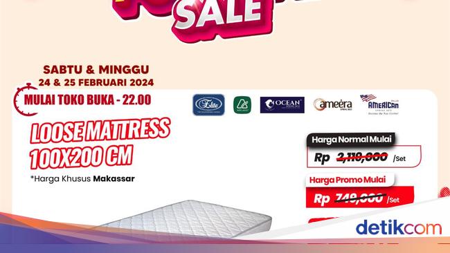 Adapun untuk di Makassar, springbed itu dijual dengan harga promo Rp 749.000 dari harga normal Rp 2.119.000. Harganya pun bisa lebih murah lagi jika pelanggan bertransaksi dengan Allo Prime, Kartu Kredit Bank Mega atau Bank Mega Syaria yakni menjadi Rp 599.200, artinya pelanggan bisa hemat Rp 1,519,800.
