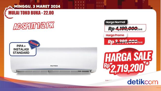 Pada gelaran tersebut AC Split 1/2 PK ditawarkan mulai harga promo Rp 3.399.000 dari harga awal Rp 4.199.000. Harganya makin murah menggunakan Allo Prime, Allo Paylater, Kartu Kredit Bank Mega atau Bank Mega Syariah, jadi hanya Rp 2.719.200.